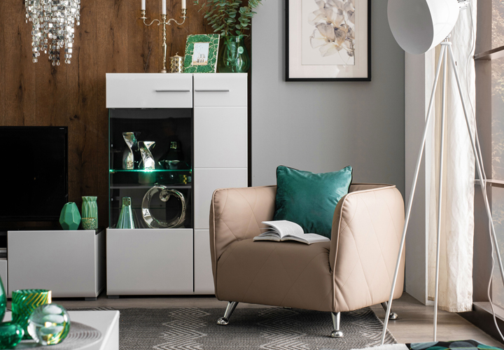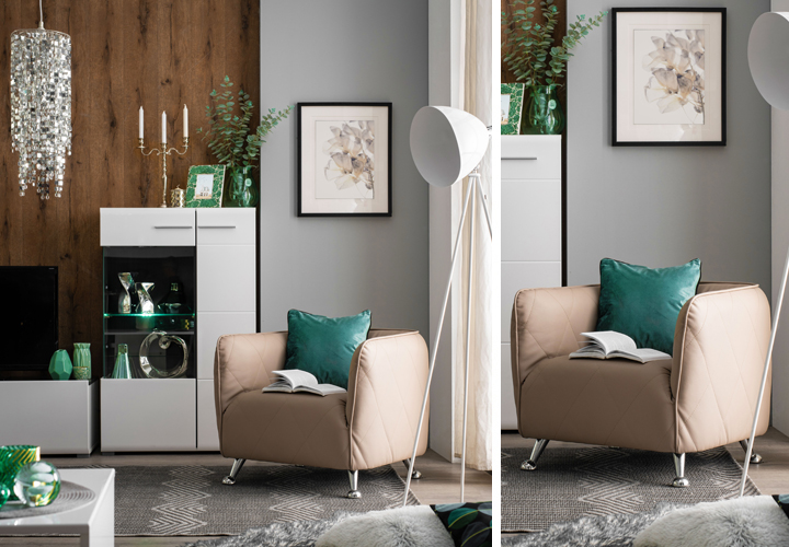 Уколико волите минималистички намештај, прави избор је витрина ЕНЗО у декору опак беле боје, црног дрвета и беле лак фолије, која заједно са фотељом БАРСЕЛОНА у беж штофу чини идеалан спој за амбијент дневног боравка. Уколико у оваквом амбијенту желите да додате топлину дрво декора са одређеном дозом рустичности, можете то учинити тапетом у дрво декору на фокусном зиду, који се најчешће налази иза ТВ полице. Увођењем ове тапете постиже се додатна топлина амбијента.