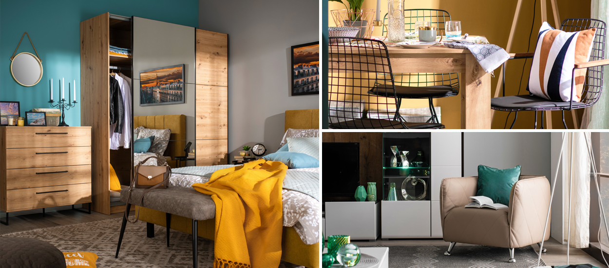 Француски лежај БАЗЕЛ у жутом штофу својим изгледом се одлично уклапа у амбијент модерне спаваће собе, као и трпезаријска клупа Б510. Својим дугим танким ногарима клупа уноси дозу елеганције, изузетно је практична и представља модерно решење за разне просторије, тако да је одличан избор поставити је у продужетку лежаја за спавање.