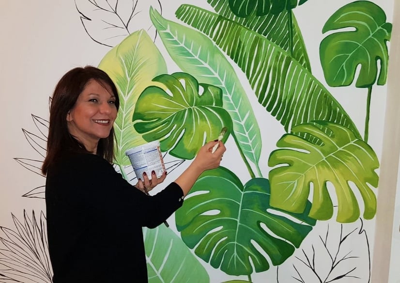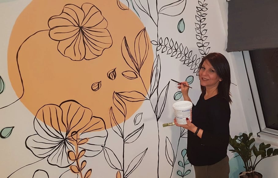 Одлучила је да сама украси зид. Узела четкице и акрилне боје и почела да слика апстрактне линије и цветне мотиве. Све ради ручно, акрилним бојама.