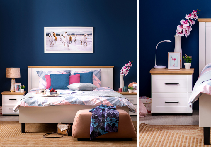Колико снажна боја може да допринесе амбијенту, можете видети на примеру спаваће собе ВАЛЕНЦИА, која представља идеалан спој модерног и рустичног. Брачни кревет ВАЛЕНЦИА и ноћни ормарић ВАЛЕНЦИА би се, уз флоралну тапету или неку земљану боју зида, лако уклопили у бохо стил, али бојењем зида у краљевско плаву боју добија се модеран амбијент у који плава боја доноси моменат елеганције и потребну дубину. Савршену равнотежу између топле атмосфере и хладног минималистичког момента можете успоставити помоћу тепиха у нијансама окер боје и детаљима у декору артисан храста.