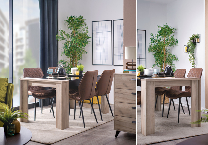 Трпезаријски сто ТОЛЕДО, у комбинацији сивог храста и црног декора, идеално ће се уклопити у сваку трпезарију због свог модерног дизајна. Захваљујући својим димензијама, задовољава и потребе многочланих породица. Његова плоча делимично је израђена од каљеног стакла, што доприноси елеганцији, а одлично се слаже уз трпезаријске столице ХТЦ-316, које пружају комфор и функционалност и представљају нови концепт у дизајну трпезаријских столица.