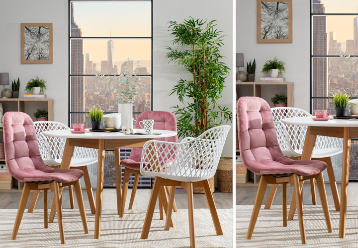 Уколико је трпезарија део мањег простора, дизајнери ентеријера Форма Идеале предлажу округле столове, попут трпезаријског стола М21ф-1 који је представник класичног дизајна и естетски се уклапа у сваки ентеријер. Трпезаријске столице Г603 у комбинацији розе штофа и дрвених ногара сјајан су додатак, а уз сто их можете комбиновати заједно са трпезаријским столицама ПС-802 , како бисте добили прави модеран амбијент, за уживање у сваком моменту.