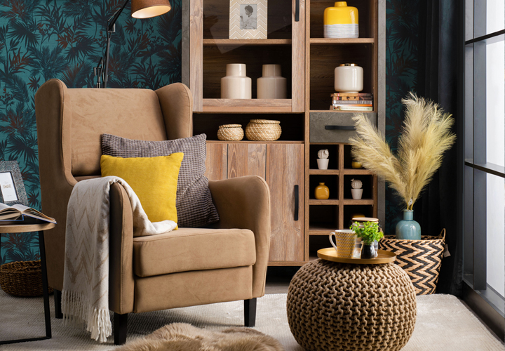 Мекани светлобраон штоф фотеље ЗУРИЦХ и плетени табуре омекшаће рустичност дрво декора осталих комада намештаја, као нпр. клуб сточића ЦОБРА, или витрине НОТЕ. Упечатљива витрина НОТЕ својим равним линијама представља грандиозну и величанствену фокусну тачку у амбијенту, а прави је избор за ентеријере са земљаном палетом боја, јер се лако уклапа са било којом акцентном бојом.