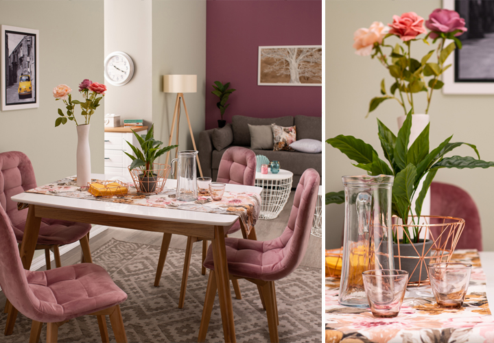 Розе боју можете применити на уређењу трпезарије, чиме бисте у амбијенту створили јаку, а опет женствену атмосферу. Романтични амбијент можете употпунити розе трпезаријским столицама Г603 са дизајном који комбинује штоф и дрвену конструкцију. Трака за трпезаријски сто у цветном дезену мали је детаљ који ће направити велику промену у изгледу амбијента, а на лежају у дневној соби можете додати јастучницу у истом дезену. Ваза са цвећем на столу прави је летњи детаљ којим ћете додатно украсити простор.