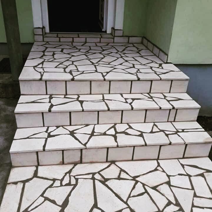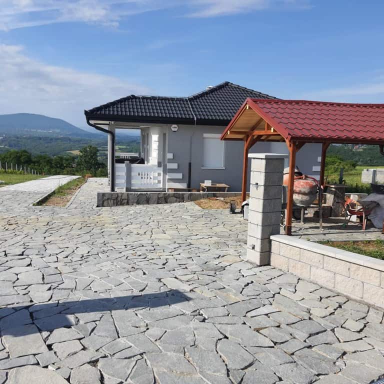 Један од свакако најчешће коришћених облика камена у уређењу сваког дома јесте поплочавање дворишта и стаза природним ломљеним каменом. Плочасти камен неправилног облика може се користити за облагање стаза, тротоара, печашких и колских стаза, ограда, фасада куће, потпорни зидови и многи други елементи. Камен за двориште је чврст и јак материјал отпоран на све врсте хабања и није тако порозан као остали материјали попут бетона, бехатона, керамике и других. Камен се не листа отпоран је на све врсте временских услова (киша, снег, лед,сунце) и оно што је јако важно изузетно лак и једноставан за чишћење и одржавање. Изузетно је важна дебљина камена у зависности за које потребе се припрема. Сече се у дебљинама 1 – 2 цм уколико је у питању пешачка стаза, темељ куће или цокла око куће, ограда или фасада неког зида. Када говорим о камену преко ког иде саобраћај неопходно је да дебљина камена буде 2 – 3цм и да има квалитетну подлогу испод. Пожељно је да подлога буде бетонска али уколико вам дебљина стазе не дозвољава бетонску подлогу може се терен припремити и шљунком или каменом туцаник и обавезно поставити мрежа од 6цм дебљине. Ломљени камен се поставља тако што се утапа у бетон или лепи лепком за керамику на већ постојећи бетон. Након постављања камен се фугује кварцним песком или цементним млеком како би се добила јединственост фугни и како би се што боље камен стопио да се кроз фугне не би задржавала вода и да не би дошло до пуцања.
