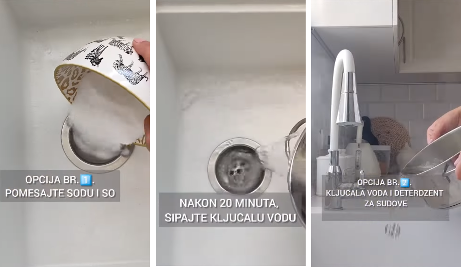 - Помешајте једнаку количину соли и соде бикарбоне, сипајте полако у одвод и оставите да делује 20 минута. Преко тога сипајте кључалу воду.