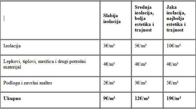 Ако додамо стандардну цену рада мајстора од 5€/м², добијамо да је цена фасаде од 14€/м² до 24€/м², што и одговара већини понуда које су доступне онлине. Међутим, у тим понудама обично је зарачунат скупљи рад мајстора, а користи се јефтинији материјал. Према томе, овде наведене цене представљају идеалну варијанту - ако клијент успе да уговорио посао са квалитетним материјалима и то плати мање од 20 евра по квадратном метру, он може бити задовољан. На ову цену треба додати цену скеле, што је битан фактор, који може подићи укупну цену и до 30%.