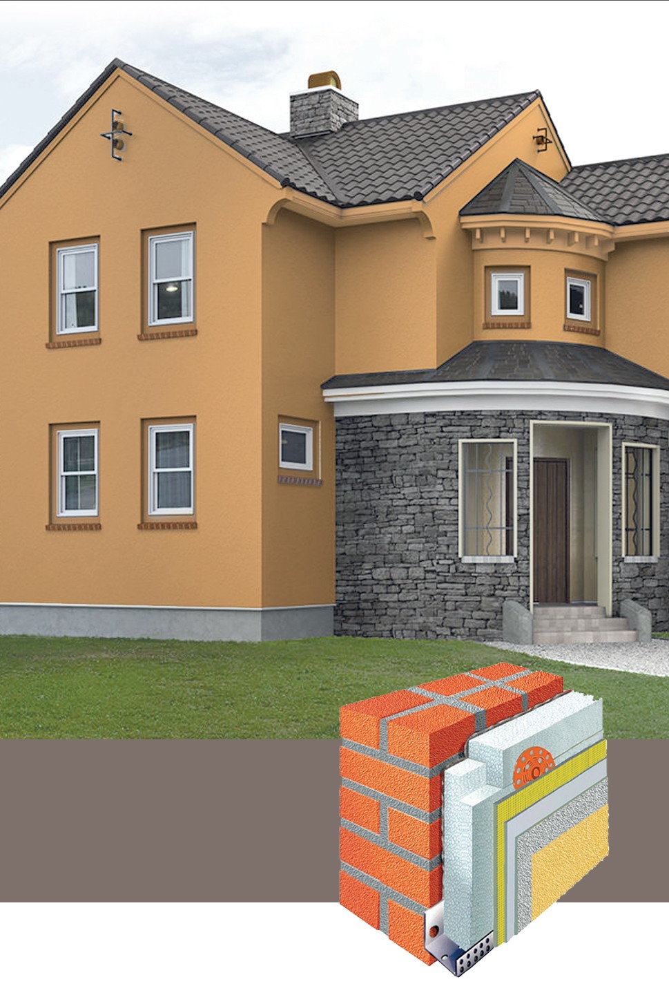 Најпознатији представник овог типа су стиропор фасаде, тј. фасаде сачињене од стиропора, стиродура или камене вуне.