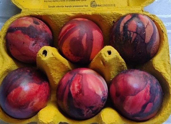 Претходно кувана јаја умачите у сирће па стављајте у цедиљку која се налази на шерпи која је на шпорету. Квасите јаја сирћетом све време. Капљите различите нијансе течне јестиве боје на јаја, па опет попрскајте мало сирћета. Поклопите и оставите на кратко, пазећи да вам цедиљка не додирује воду.