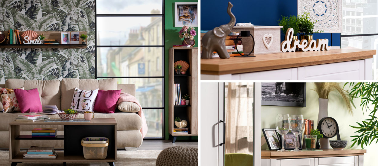 У свакој просторији у дому може се наћи место погодно за декорацију, па чак и у спаваћој соби, уколико имате слободну горњу површину комоде. Поред омиљених књига које читате пред спавање, на њу можете додати и романтичну кутију у коју ћете спаковати накит, али и још неке декоративне предмете, попут керамичке фигуре слона. Украсни сталак са рељефним орнаментима би се такође одлично уклопио у овај романтични кутак, као и декоративна слова са натписом "DREAM" за слатке снове. За потпуни ефекат, додајте и мало зеленила у виду вештачког цвећа, уколико нисте љубитељ собног биља у спаваћој соби.