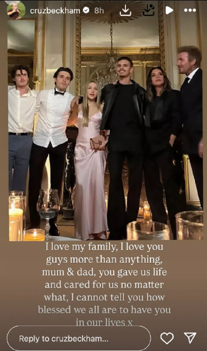 Њихов млађи син Круз Бекам огласио се убрзо након Бруклинове објаве. Шеровао је ову слику и поручио: „Волим своју породицу. Волим вас више од свега, мама и тата, дали сте нам живот и бринули се за нас без обзира на све. Не могу вам описати колико смо сви благословлени што вас имамо у својим животима".