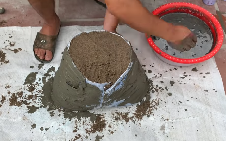 Саксије можете направити и од других материјала којима ћете прекрити, рецимо, пањ и такође их премазати цементом. Да би се добио валовити ефекат кроз ивицу материјала треба провући жицу.