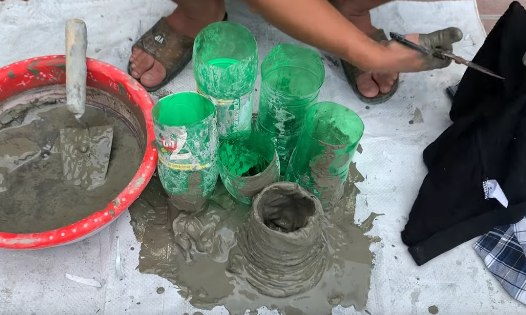 Трећа врста саксија може да се направи од пластичних флаша. Исеку се на пола и поставе на мало просутог цемента.