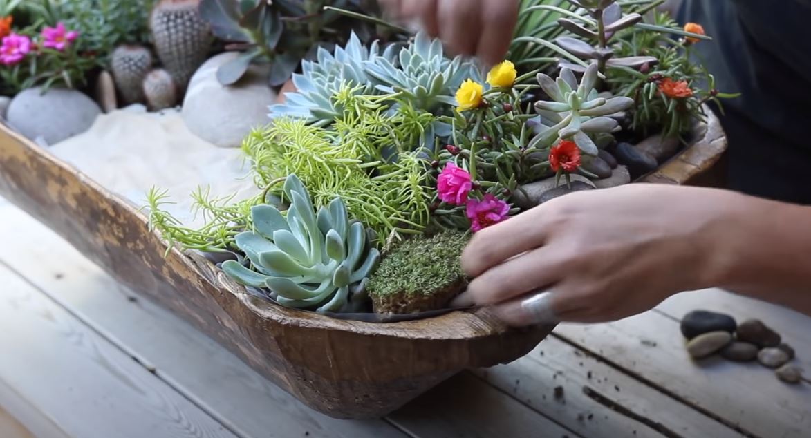У дрвеној овалној саксији налик на чамац, ова жена из видеа у стању је да направи право мало зелено царство – башту као из бајке.