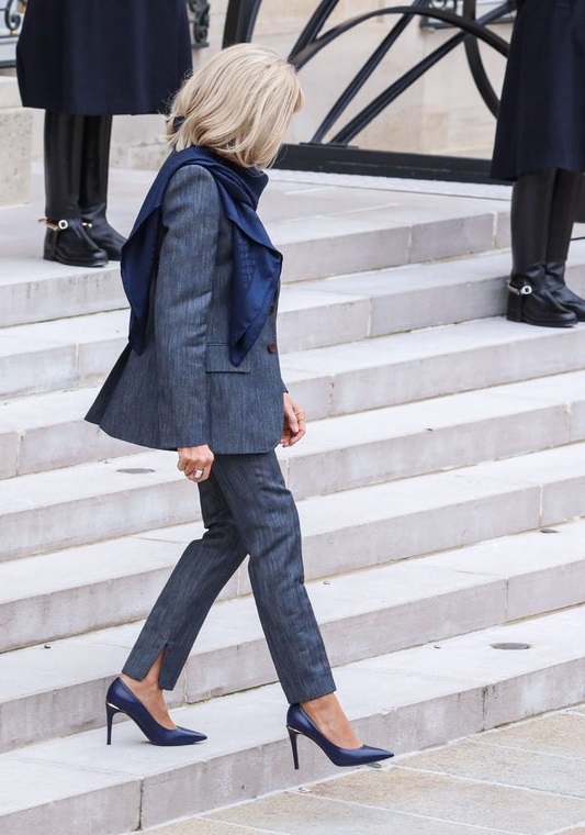 Брижит Макрон бира елегантно одело у сивој боји, која јој је једна од омиљених, уз црну, тегет и белу.