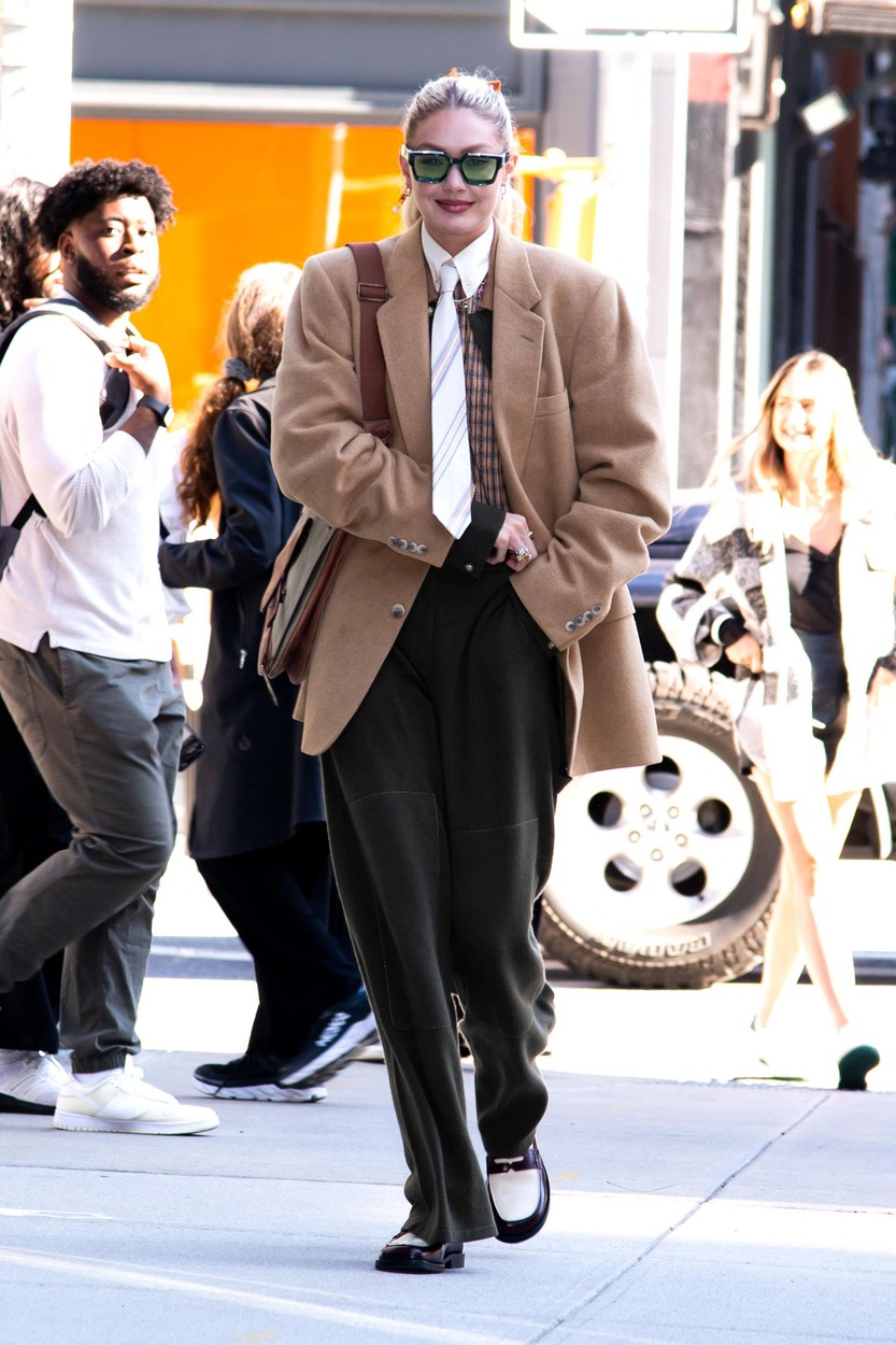 Двадесетседмогодишња манекенка носи карирану кошуљу и кравату уз широке панталоне, док преко има превелики блејзер. Све ово понела је уз неизоставну обућу ове јесени - мокасине. Ипак, овакав избор гардеробе је нешто на шта нисмо навикли да видимо код Ђиђи која је увек савршено стилозована. Сада ју је сва широка гардероба "прогутала", а спој сличних боја учинио непрепознатљивом, тако да се многи питају шта би рекао Леонардо ди Каприо са којим су је у последње време повезивали.