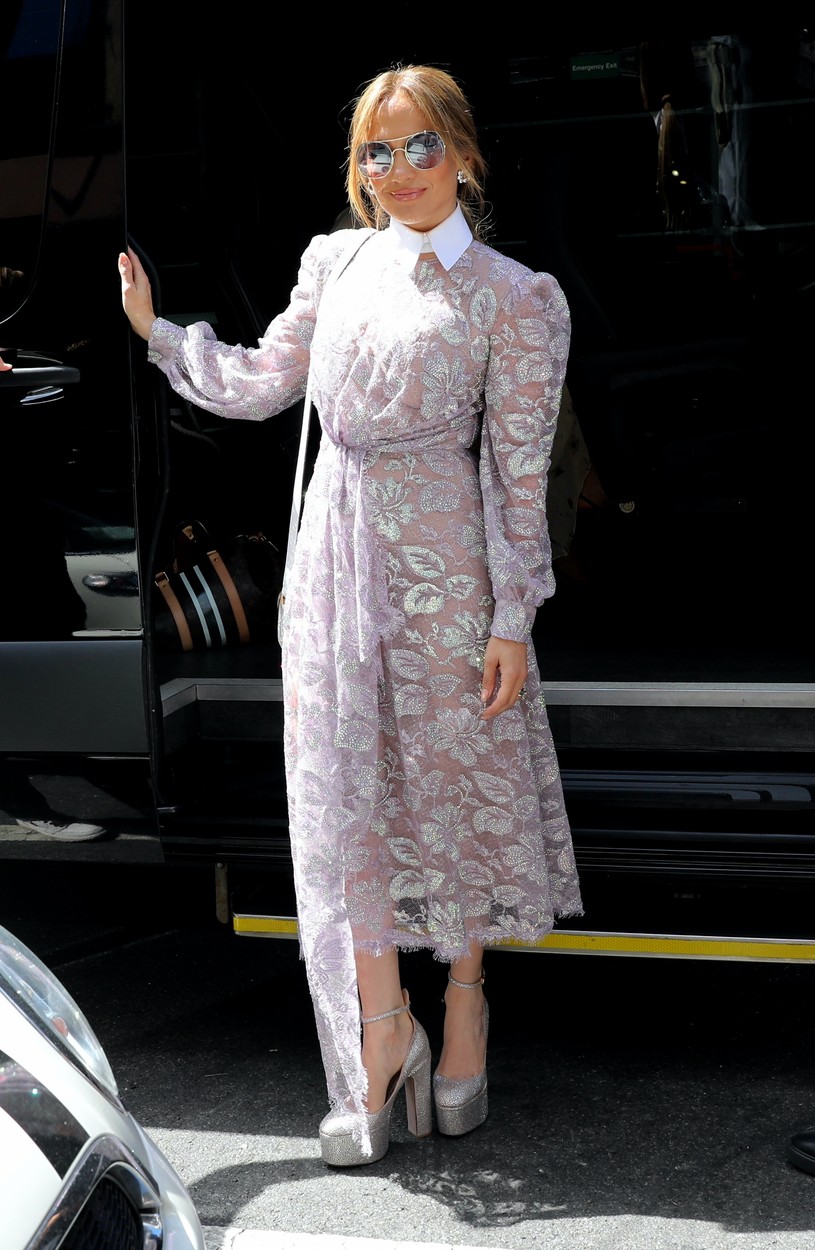 Џенифер је као и увек и сада имала модне комбинације које не можемо да не приметимо. За шетњу Менхетном одабрала је интересантан чипкани модел хаљине, миди дужине. Хаљину парте дугачки, пуф рукави који су све популарнији и код нас, а долазе из 60-их година прошлог века. Носи вртоглаво високе потпетице, које обожава и од којих не одустаје у било које доба дана.