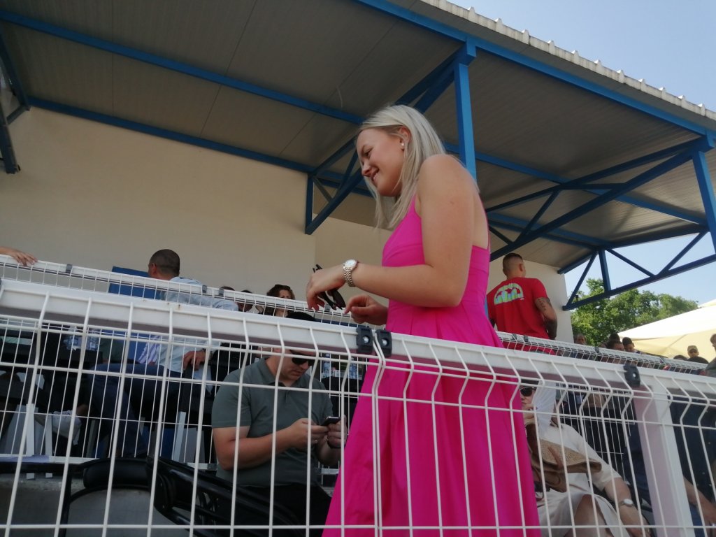 Појавила се на трибинама у боји ове сезоне. Носи розе макси хаљину А кроја са бретелама, док је од обуће одабрала папуче са каишевима које су изузетено популарне и током овог лета.