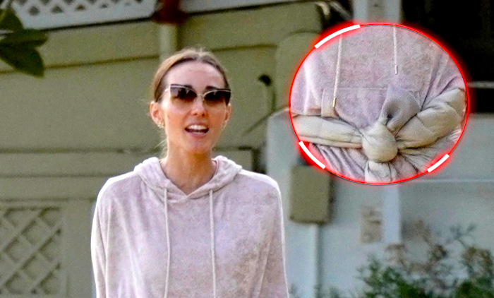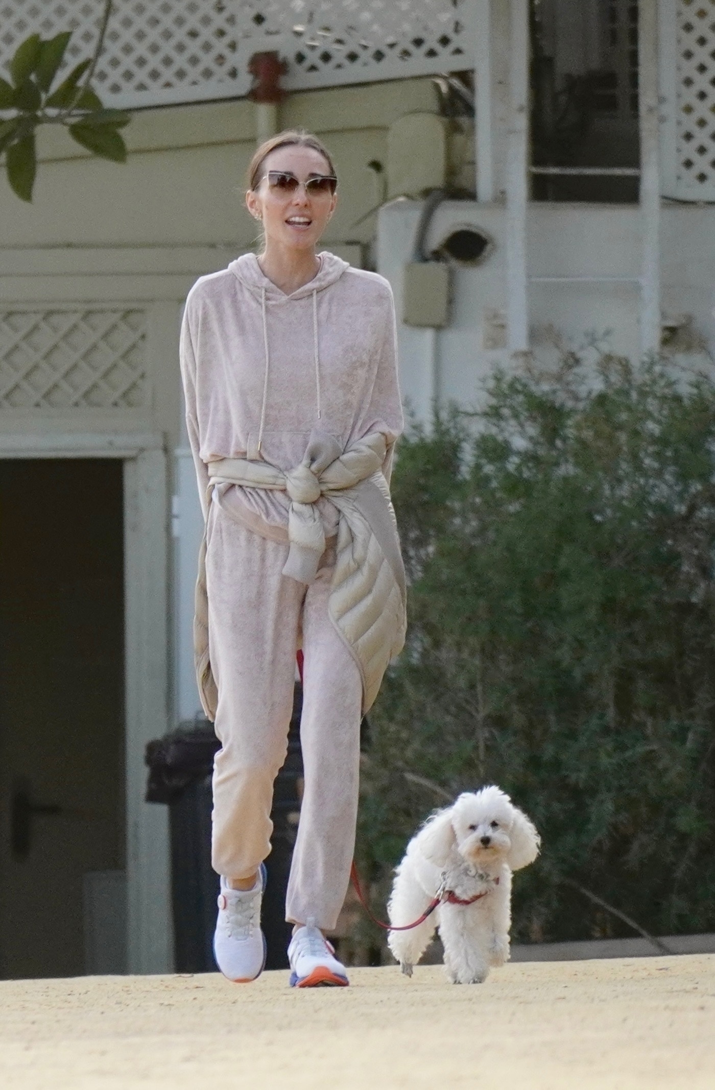 У питању је плишана комплет тренерка у светлој боји, мало ширег кроја. Преко ње ње носила беж јакну коју је везала око струка. На ногама је имала патике погодне за дуге шетње. Коса јој је била везана у опуштену пунђу, а од модних детаља имала је само наочаре за сунце које пристају њеном облику лица.