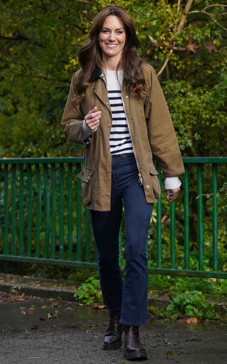 Кејт је сада примећена у правом јесењм изгледу. Носи тамне фармерке, пругасти џемпер и зеленкасту јакну у којој смо је већ видели неколико пута. Салонке је овог пута заменила чизмама које су се савршрено уклопиле уз остатак њеног изгледа.