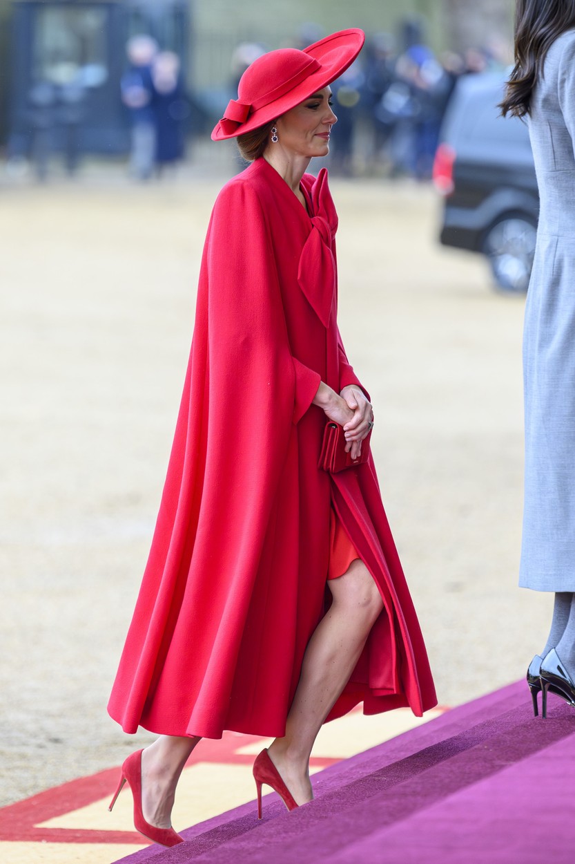 Кејт се за ову прилику одлучила за црвену хаљину до колена, црвени капут са машном, шешир и торбицу у истој боји и наравно салонке у идентичној нијанси и све би било савршено да је папараци нису ухватили током изласка из аута.