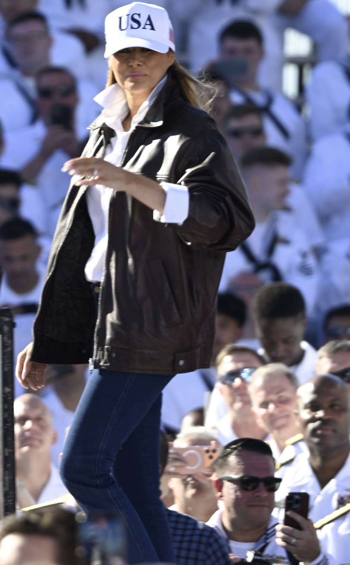 За посету поморској станици у Вирџинији, Меланија је одабрала бомбер кожну јакну коју је уклопила са белом кошуљом и тамнијим фармеркама. То не би било то без ефектног качкета на ком је писало УСА, а цела њена комбинација је подсећала на једну сцену из филма.