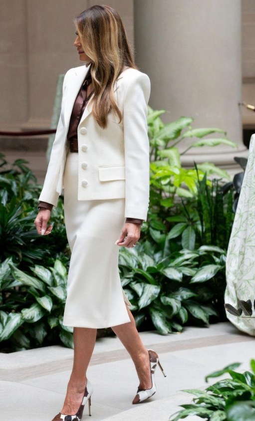 Меланија Трамп носила је одело и браон свилену кошуљу, креације модне куће Долче енд Габана. Као модни зналац не пропушта тренд беле боје, али ни најаву великог повратка браон одеће.