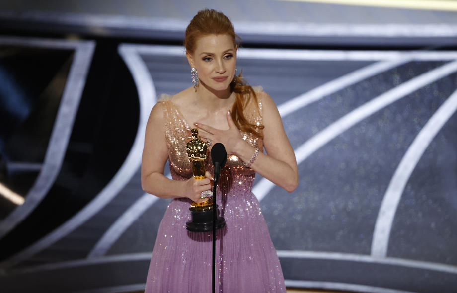 Џесика Честејн је звезда на црвеном тепиху на 94. додели Оскара. Глумица (45) стигла је на највећу холивудску ноћ у светлуцавој златно-љубичастој Гучи хаљини са драматичним, набораним порубом од тила. Изглед је употпунила златним платформама Стјуарта Вајцмана, сребрном наруквицом и висећим минђушама (представљене са високим репом).