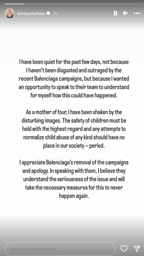 - Ценим што је Баленсијага уклонила кампање и извињење које су упутили. У разговору са њима, верујем да разумеју озбиљност проблема и да ц́е предузети неопходне мере да се то више никада не понови - додала је Ким.
