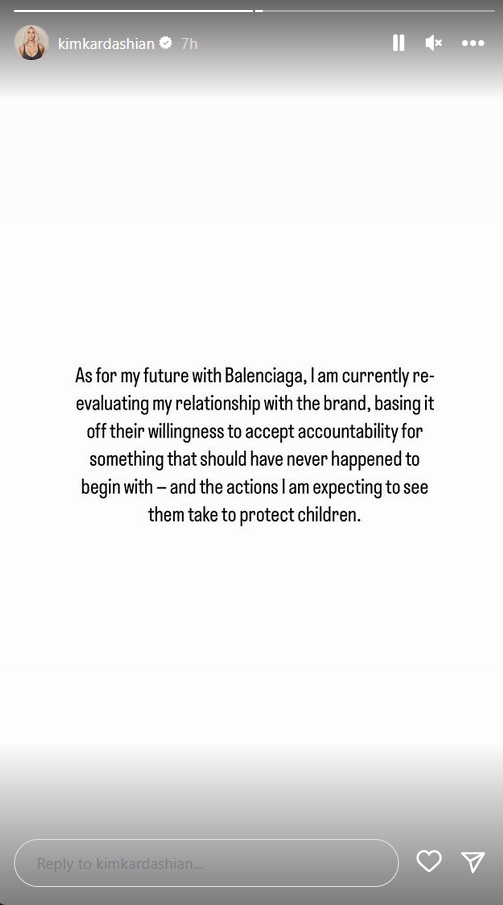 - Што се тиче моје будуц́ности са Баленциагом, тренутно преиспитујем свој однос са брендом, базирајуц́и га на њиховој спремности да прихвате одговорност за нешто никада није требало да се догоди - и радњама које очекујем да предузму да би заштитили децу.