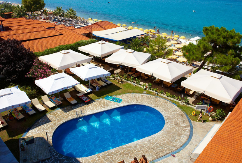 Na poluostrvu Kasandra, a u letovalištu Hanioti, nalazi se hotel Grand Otel 4*. Raspolaže sopstvenom plažom, bazenom, parking prostorom. Usluga u hotelu je polupansionska. Za sobu na 7 noćenja u avgustu treba izdvojiti najmanje 560 evra. Slobodnih mesta ima već od 31.7. U septembru je najniža cena aranžmana čak 435 evra.