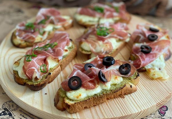 Iseći hleb na kriške premazati pesto sosom, pa staviti odozgo mocarelu po ukusu i zapeći na 240 stepeni svega 10 minuta. Kad izvadite iz šporeta stavite odozgo pršutu. Ukoliko ih pravite sa šunkom pecite sve zajedno.