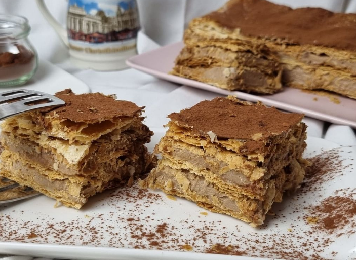 Lisnato testo podeliti na tri dela i rastanjiti na dimenzije po svojoj meri, sve u zavisnosti koliki pleh imate. Svaku koru posebno peći, 20 minuta na 200 stepeni, zatim izvaditi iz rerne, pa preko kore ravnomerno posuti 2 kašike šećera u prahu i vratiti u rernu na 3-4 minuta, da se šećer karamelizuje. Ovako ispečene kore ostaviti da se ohlade.
