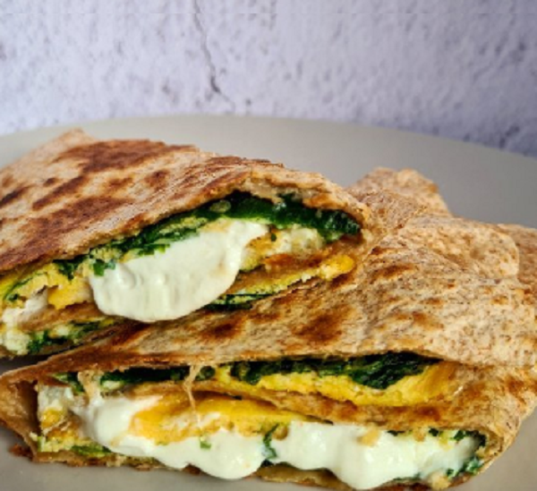 U tiganj stavite mast ili ulje, ako imate dobar tiganj dovoljno je na vrhu kašičice, dodajte spanać i propržite po ukusu par minuta. Ulupana i posoljena jaja izvucite preko, rasporedite varijantu ako treba i otvoriti poklopcem. Neka se tako prođe 3,4 minuta i onda pokrenite omlet i stavite tortilju preko i ostavite još 2 minuta otkriveno da se zapeče, pa pokrenite i da se zapeče tortilja. Kada sklonite sa tiganja dodajte svež sir i urolajte.