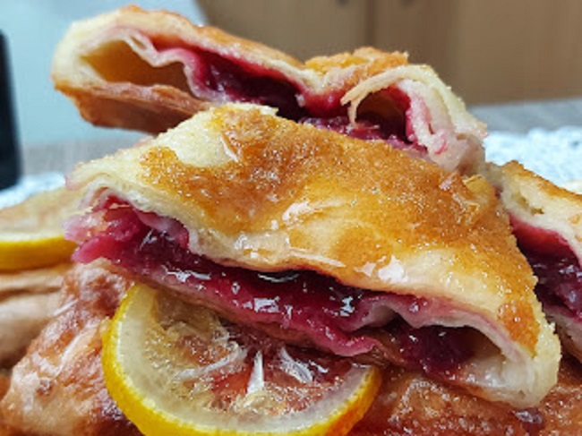 - Jaja umutiti sa šećerom dodati griz sa praškom za pecivom jogurt i ulje i izmešati. Koru premazati većom kašikom jaja, saviti donji deo pa presaviti gornji deo preko donjeg i premazati opet malo jaja. Na početku staviti kašiku višanja i presavijati u trougao.