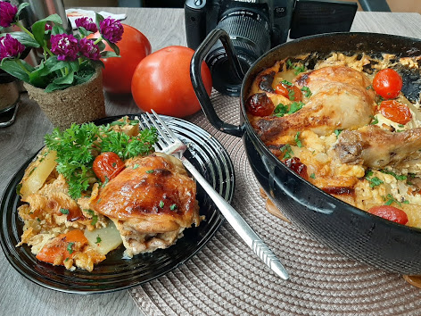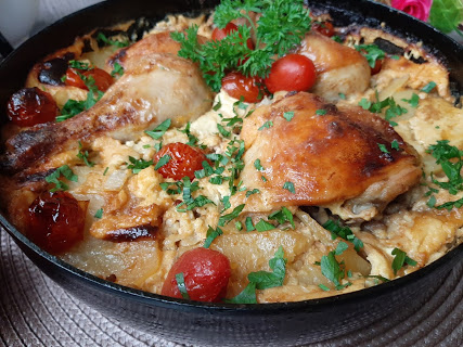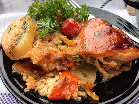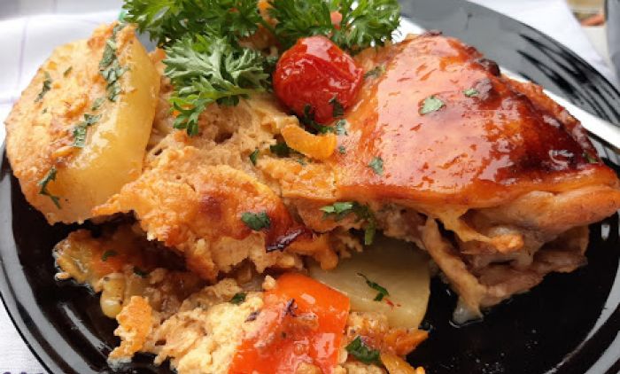 Meso posoliti i premazati uljem i malo alevom paprikom. Poređati preko krompira. Peći na 200 stepeni C oko sat vremena, možda i više... da lepo zarumeni.
