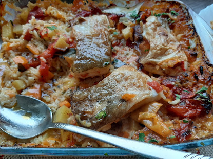 Ubaciti sečen oljušten paradajz. Ribu posoliti i pouljiti i staviti na pirinač.