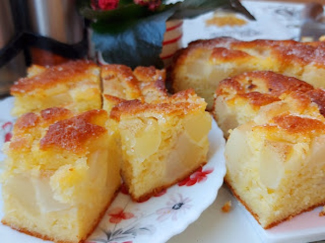- Pleh manji obložiti pek papirom, dodati umućeno testo pa rasporediti kocke kruške.