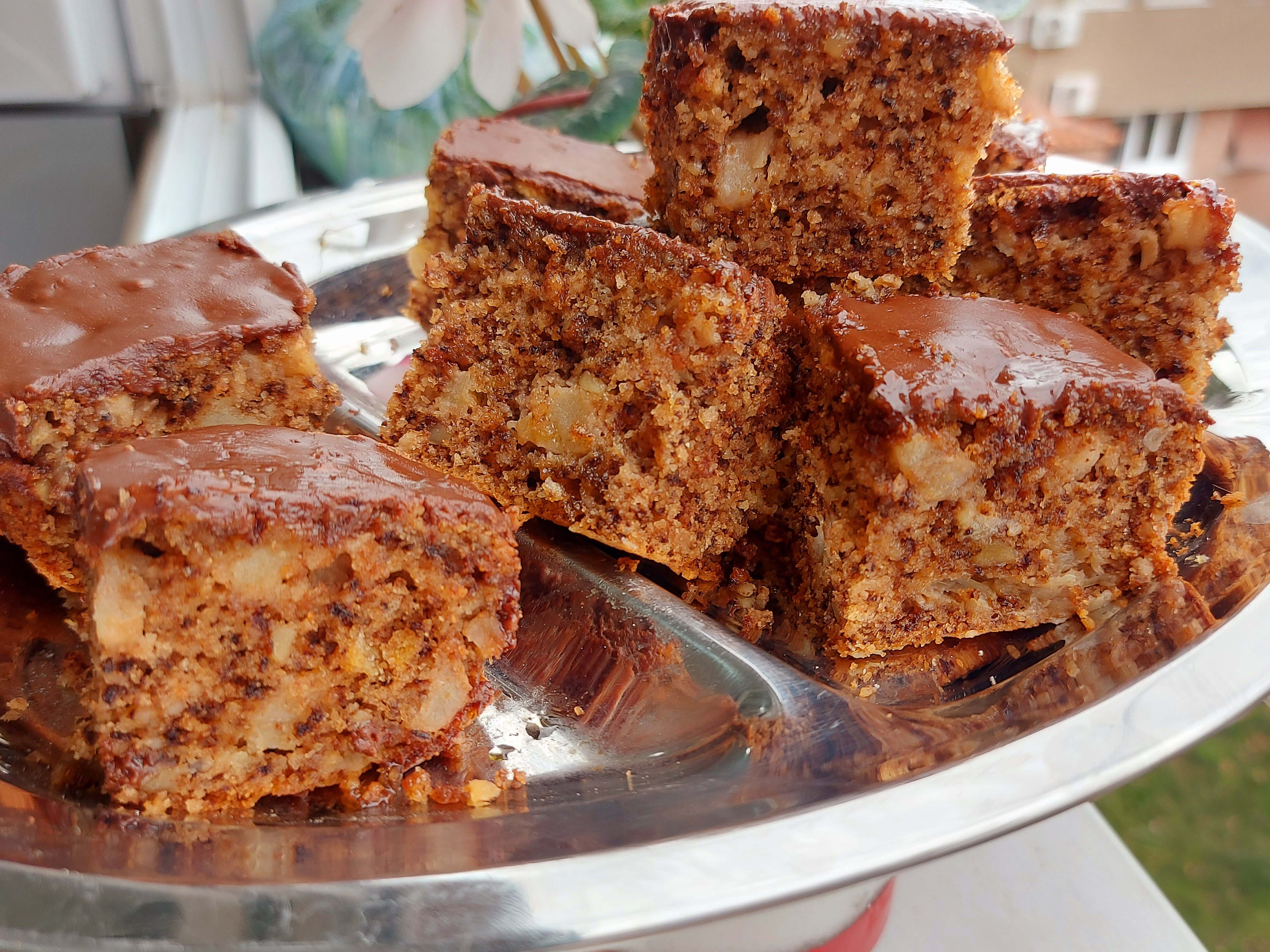 Umutiti jaja sa šećerom dodati griz sa praškom za pecivom . Samleti čajnne keksiće sa orasima pa dodati u jaja, ubaciti ulje, mleko i jabuke iseckane na kockice. Sve lagano izjednačiti. Pleh 30x18 podmazati sa uljem i posuti brašnom. Sipati testo u pleh veličine 30 x 18 cm i izjednačiti. Peći na 200 stepeni C oko 45-50 minuta. Po želji preliti čokoladom.