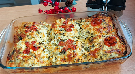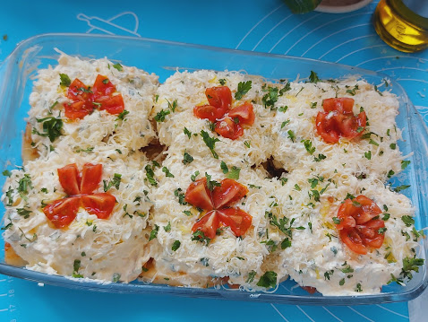 Odozgo narendajte drugi deo kačkavalja. Ja sam ukrasila čeri paradajzom. Peći na 190 stepeni 50-60 min. Služiti uz salatu i, obavezno, neku čorbicu ili supu..Uživajte, fantastično jelo koje kad probate uvek ćete praviti.