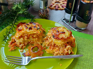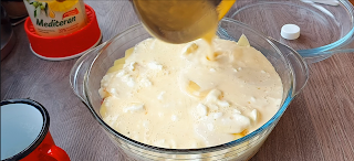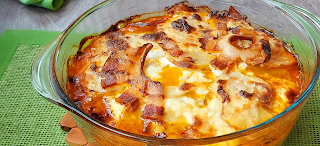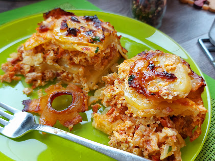 Prekriti ostatkom krompira, 200 ml mleka ili jogurta sve dobro izjednačiti i preliti. Peći na 220 stepeni C oko 45-50 minuta da lepo uzarumeni.