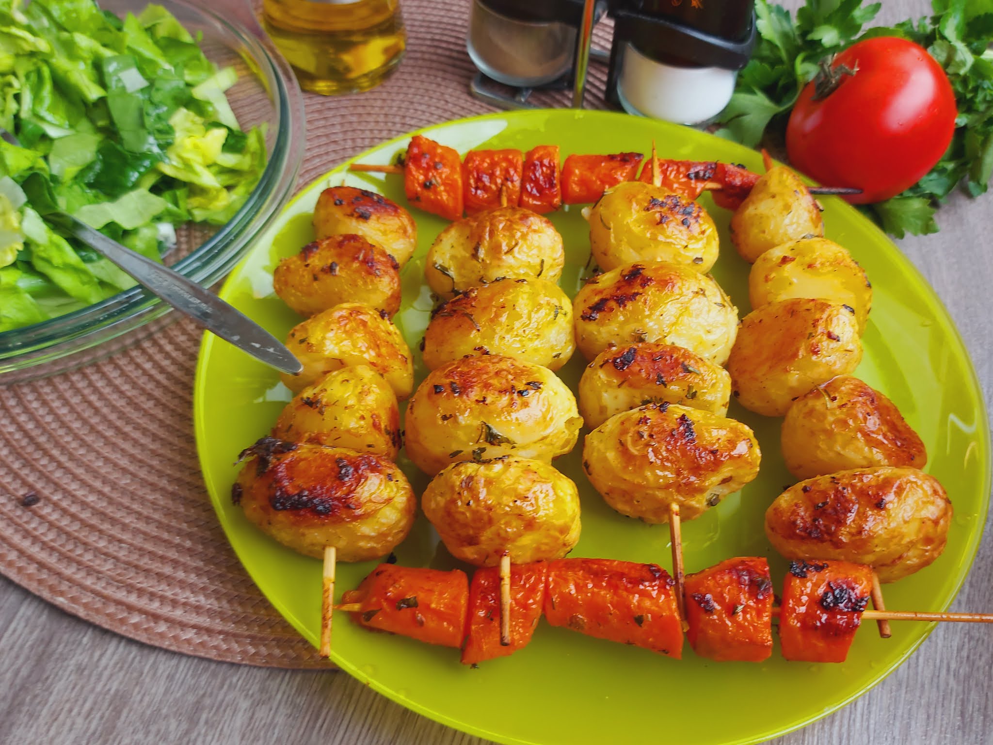 Na štapice za roštilj nabosti krompir i šargarepu. Ređati u podmazan pleh i preliti ostatkom marinade. Peći na 220 stepeni oko 20-30 min