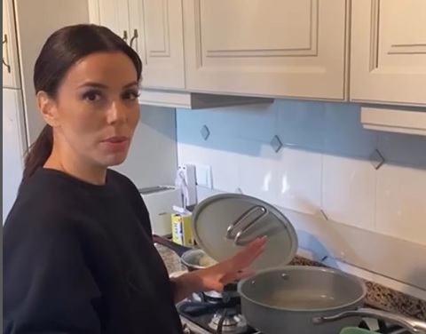 Longoria je tiganj napunila uljem, dodala iseckan krompir, a onda i kolutove luka. Sačekala je da se to proprži, a zatim na istom ulju ispržila jaja na oko. Na kraju je sve sjedinila, a po izrazu njenog lica možemo da zaključimo da je i te kako ukusno.