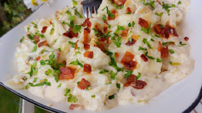 - Ostaviti 2 kašike slanine i 2 kašike pavlake za dekoraciju. Preliti pavlakom preko kuvane testenine.