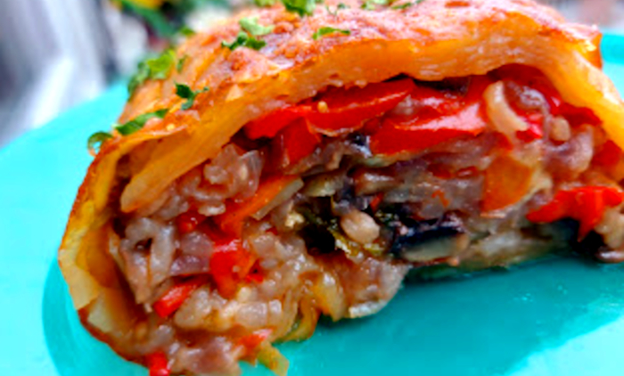 Izvaditi iz rerne pa na njega istresti šampinjone sa paprikom i rasporediti. Dodati rendan krompir. Polako uz papir uviti krompir u rolat..