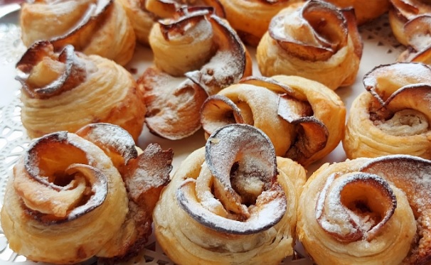 Jabuke iseći na tanke listiće (koristiti rende) i poređati po mlevenim orasima duž. Malo saviti testo pri dnu pa uviti u ružicu kao što je prikazano u Videu.