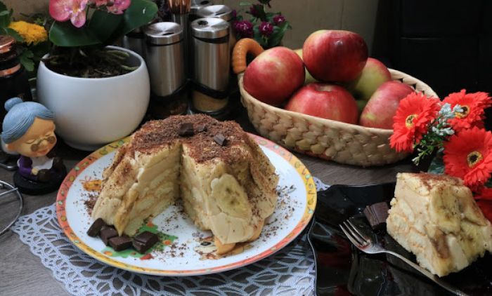 Kalup obložiti prozirnom folijom pa poređati sečenu bananu na dno i sa strane, sipati trećinu pudinga pa poređati piškote.