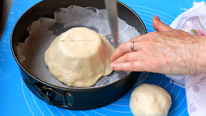 Pokriti da malo odmore. U ukrugli pleh 24 cm obložiti pek papirom pa na sredunu staviti malu okruglu tacnu. Zadnju lopticu razviti i poklopiti tacnu, a zatim je iseći na 8 trouglova.