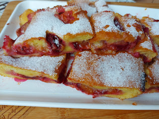 Sipati u tepsiju, poređati voće, ovoga puta šljive seći na pola. Peći na 200 stepeni C oko 40 min.