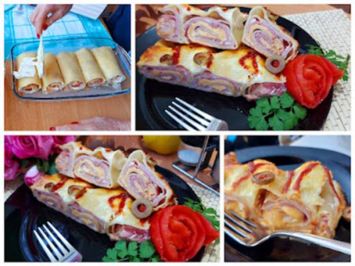 Uviti u rolnicu i ređati u podmazan pleh. Peći na 200 stepeni C oko 35 min.